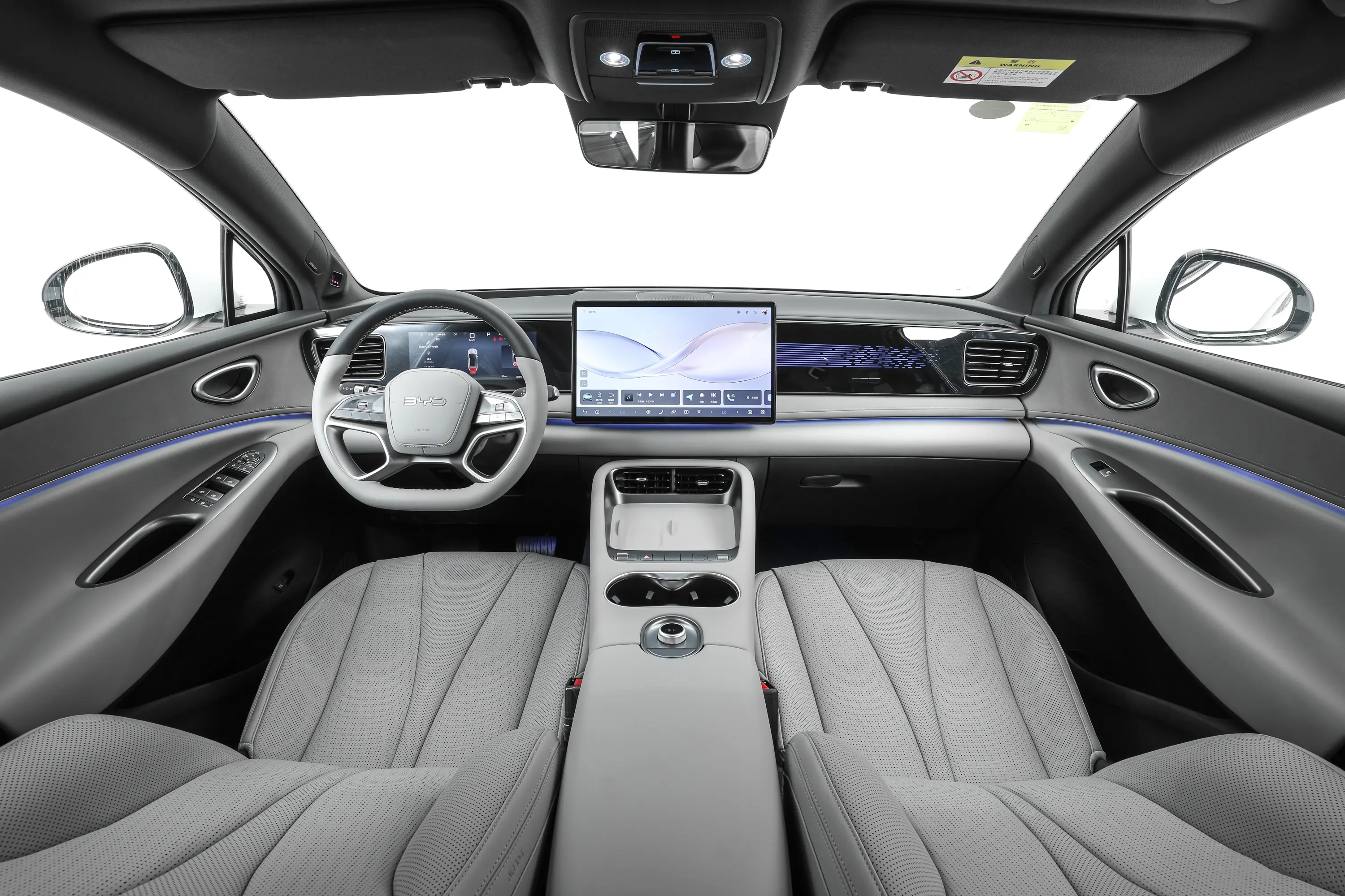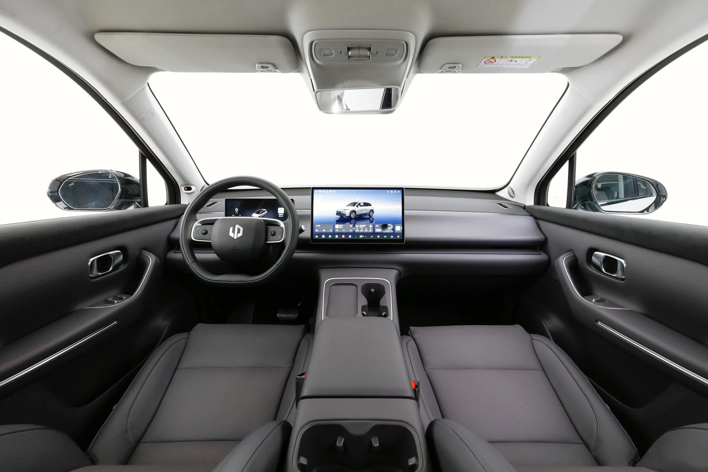内饰方面,如果把方向盘挡住了,这三款车是不是很像?其实它们都采用了新能源汽车很主流的简约风格,视觉中心就是中控屏幕,而且它们都采用了电子怀挡的换挡机构,不会占用前排地台的空间。