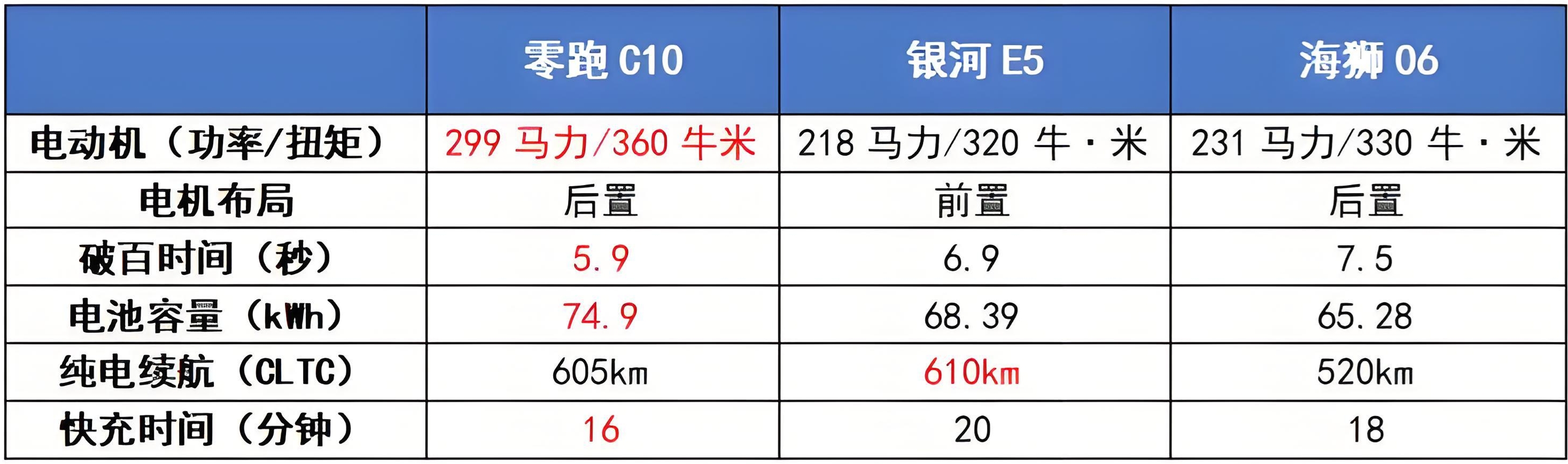 标红的越多,就说明功能和配置越有优势,海狮06标红了4项,银河E5标红了2项,零跑C10标红了7项。零跑C10的配置确实更丰富,功能确实更齐全。