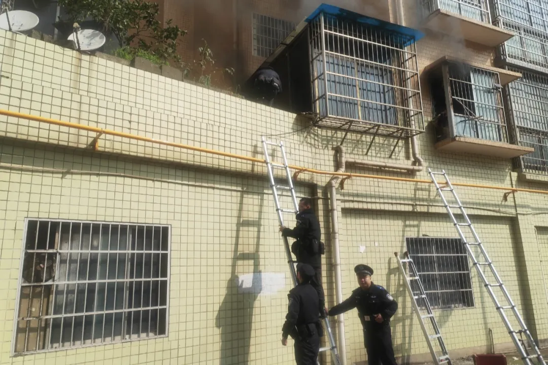 此时,事发地二楼窗户被防盗网死死封住,浓烟不断从窗缝涌出,一名女子抱着幼童趴在窗边,焦急地呼喊求救!蔡开洋扫视四周,发现墙角有若干架梯子,立即架好攀爬而上。他抽出铁锤,对准防盗网猛砸——“咣!咣!咣!”金属撞击声刺耳,可防盗网却纹丝不动。