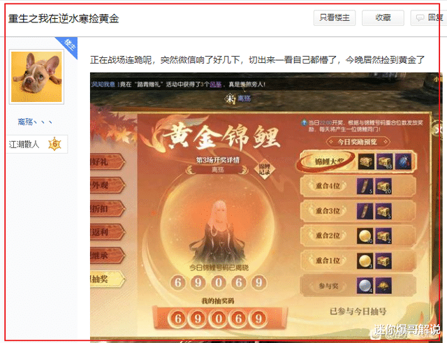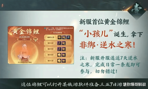 官方晒出数十万玩家的现况后,还顺便报道了新服当天出现的黄金锦鲤,这位玩家中了顶级大奖开出了非绑定的逆水之寒词条,这可是目前游戏里最稀有的装备词条,据说当场卖给神豪大哥赚了1.2万元!
