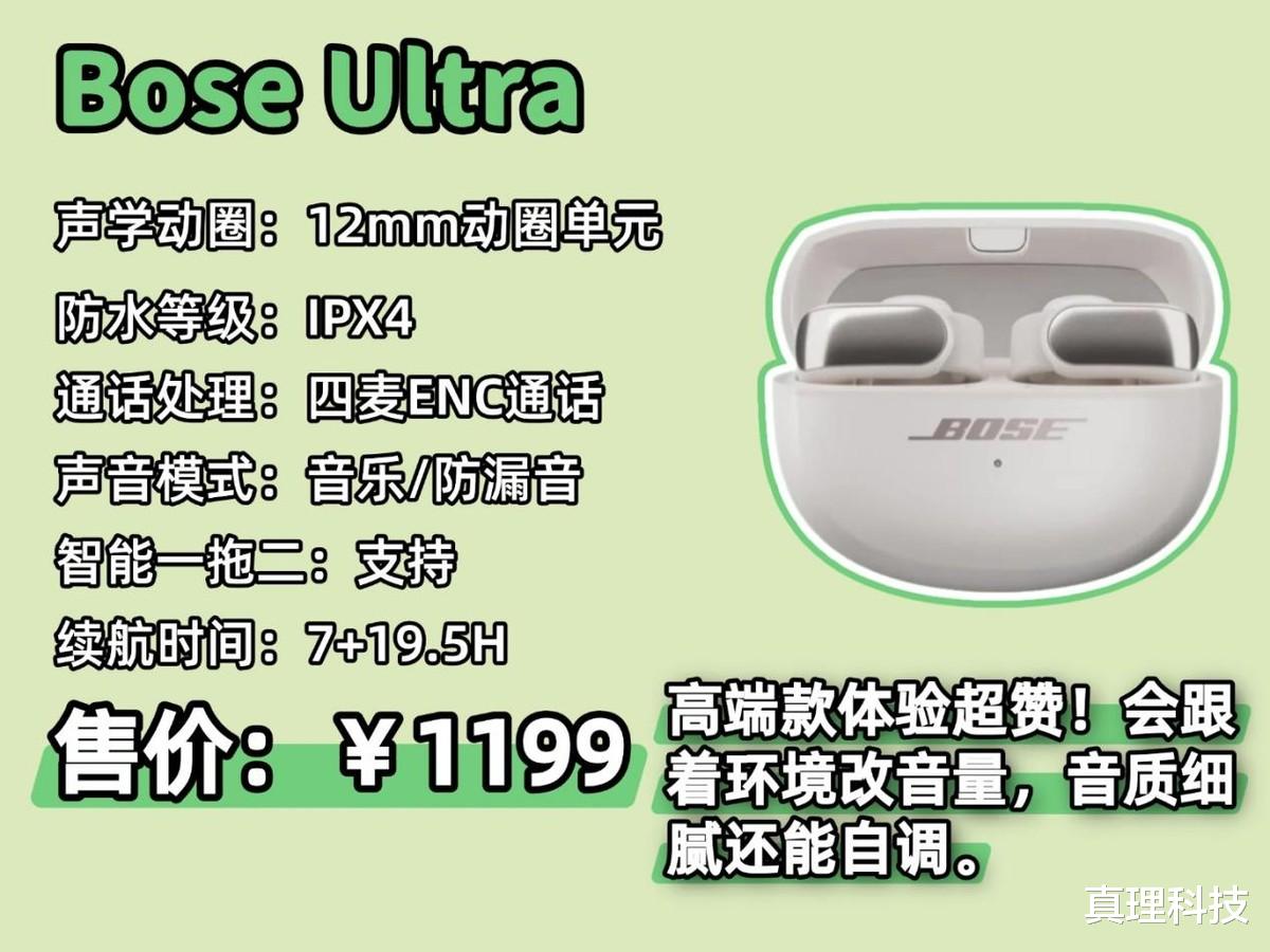 Bose Ultra价格:1199元推荐理由:高端款体验超赞!会跟着环境改音量,音质细腻还能自调。