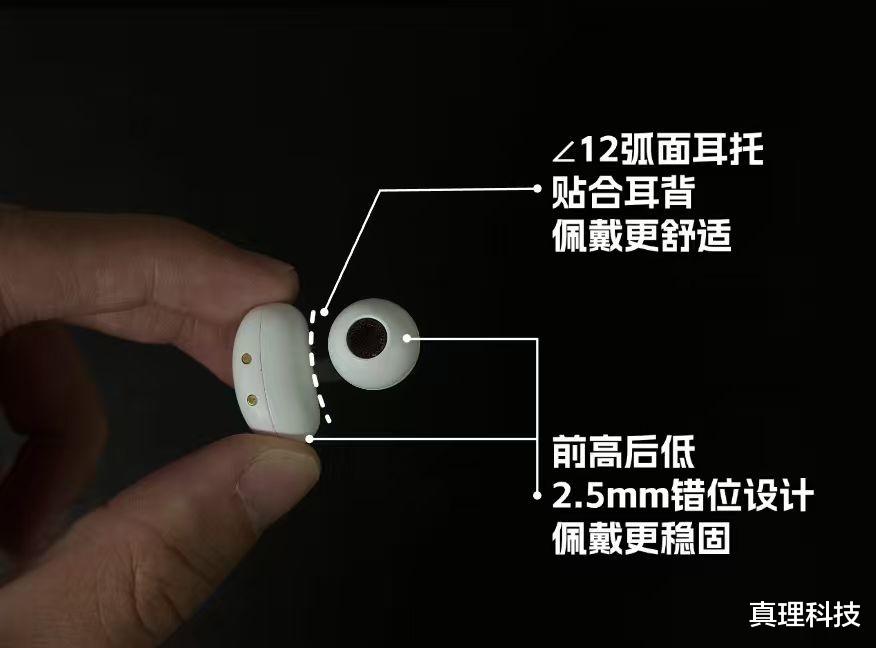 这款耳机的佩戴给人的感觉很舒服,耳机做了2.5mm 错位设计成前高后低的样子,卡耳廓上很稳。12°弧面耳托可以给耳朵提供合理支撑贴得牢,不压耳朵,单耳仅4.5g,戴久了也没有压耳的感觉。