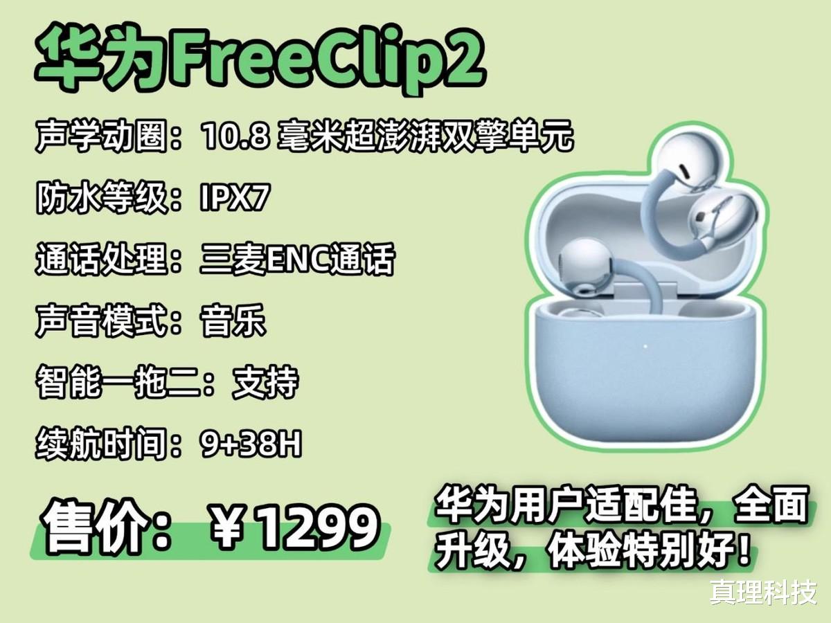 华为FreeClip2价格:1299 元推荐理由:华为用户适配佳,音质通话比起上一代全面升级,使用体验特别好!