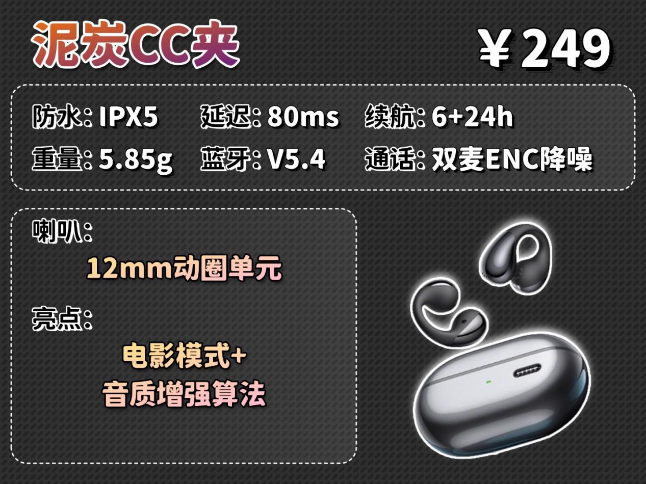 泥炭CC夹在佩戴上采用液态硅胶包裹高韧记忆钢丝的设计,能牢固贴合耳廓,佩戴稳固不易脱落,但长时间使用舒适度较为一般。音质上配备动圈单元与全景空间音效,声音层次清晰,低音表现饱满有力。性能上支持电影、游戏、音乐多场景模式,具备日常防水与清晰通话降噪,并可实现双设备切换,不过单次续航时间较短。虽然它的佩戴舒适性和续航表现存在不足,但它的音质表现扎实、佩戴稳固且场景适应性强,是运动通勤中注重实用听感的不错选择。