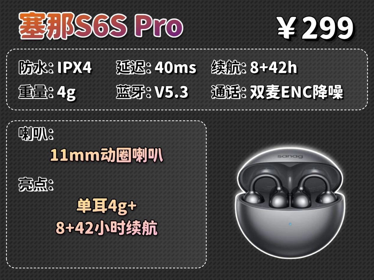 塞那S6SPro在佩戴上采用C形桥与贴合耳廓的设计,机身极为轻巧,长时间使用几乎感觉不到负担。音质上依靠动圈单元与全景音增强技术,声音开阔自然,能满足日常听歌看视频的需求,但整体表现中规中矩。性能上支持低延迟游戏模式,通话降噪清晰,具备生活防水,且续航非常持久,无需频繁充电,不过它不支持一拖二连接。虽然它的音质和性价比不算突出,但有着轻盈无感的佩戴和超长的续航表现,是一款注重佩戴舒适性和续航的耳夹。