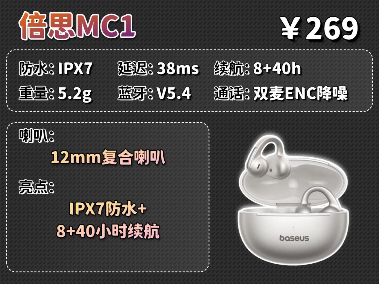 倍思MC1在佩戴上采用C形桥结合弹性缓压气囊的设计,能温和分散耳部压力,机身也较为轻巧,长时间使用舒适感良好。音质上配备复合喇叭与空间音效,人声表现清晰,但整体听感中规中矩,音量开大时存在可察觉的漏音。性能上具备高等级防水,不怕汗水和雨水,续航很持久,还支持一拖二连接和清晰的通话降噪。虽然音质不算突出且有漏音问题,但它的佩戴很舒适、还有出色的防水和持久的续航,是一个看重实用性和耐用性用户的可靠选择。