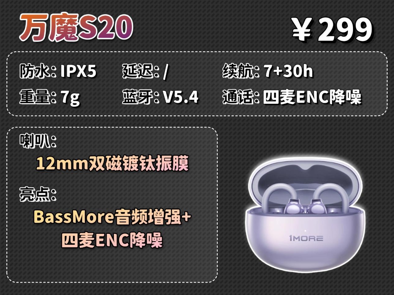 万魔S20在佩戴上采用3D人体工学与记忆合金耳挂,能稳固贴合耳廓,但单耳约7克的重量明显偏重,长时间佩戴舒适度一般。音质上搭载双磁镀钛振膜与全景空间音效,声音开阔立体,不过音量开大时漏音比较明显。性能上具备四麦克风通话降噪,实际通话人声清晰,续航可满足日常使用,但不支持一拖二连接。总的说来,它的单耳重量稍重,而且漏音表现明显,但它的通话质量和佩戴稳固性表现扎实,是对通话清晰度有要求用户的实用选择。