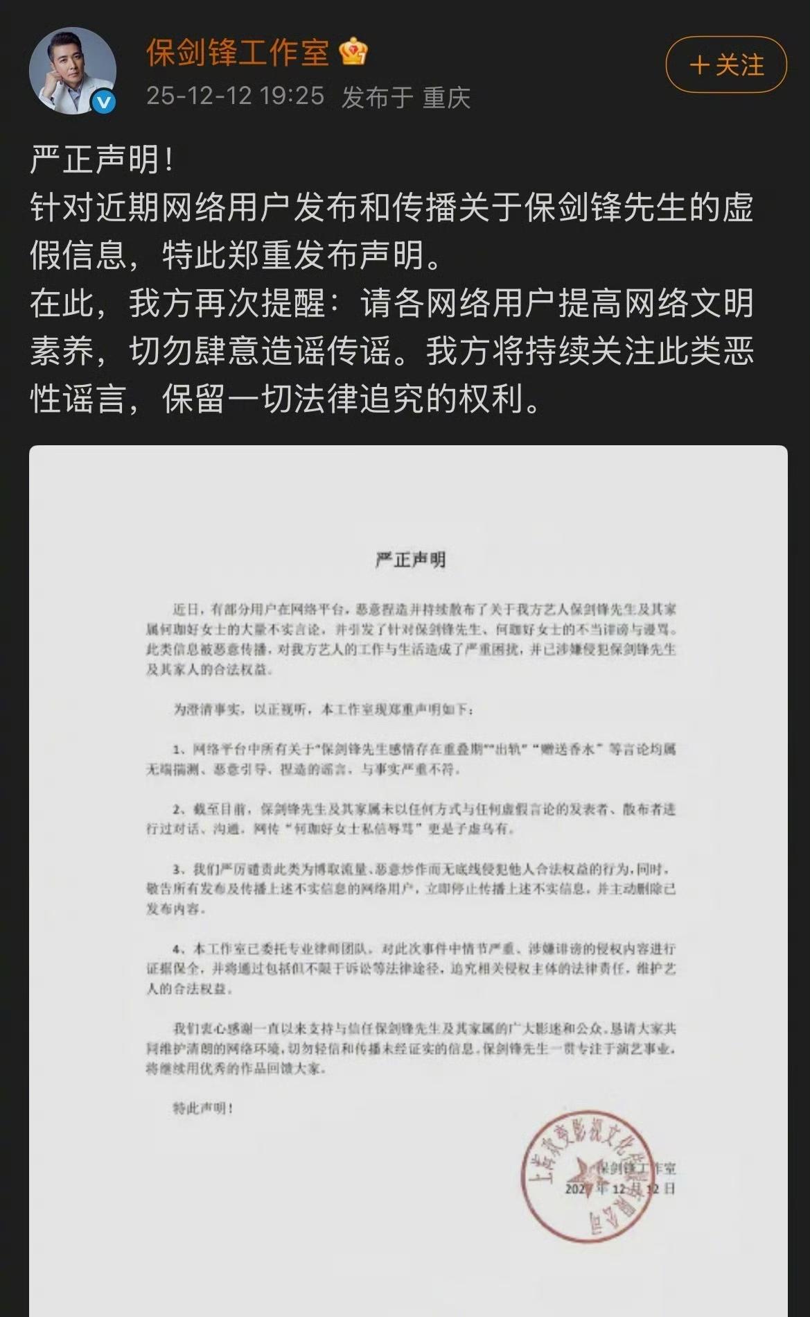 随着舆论不断升高,保剑锋方也在12月12日晚间发布声明,回应争议的同时也否认网络中的不实传言。