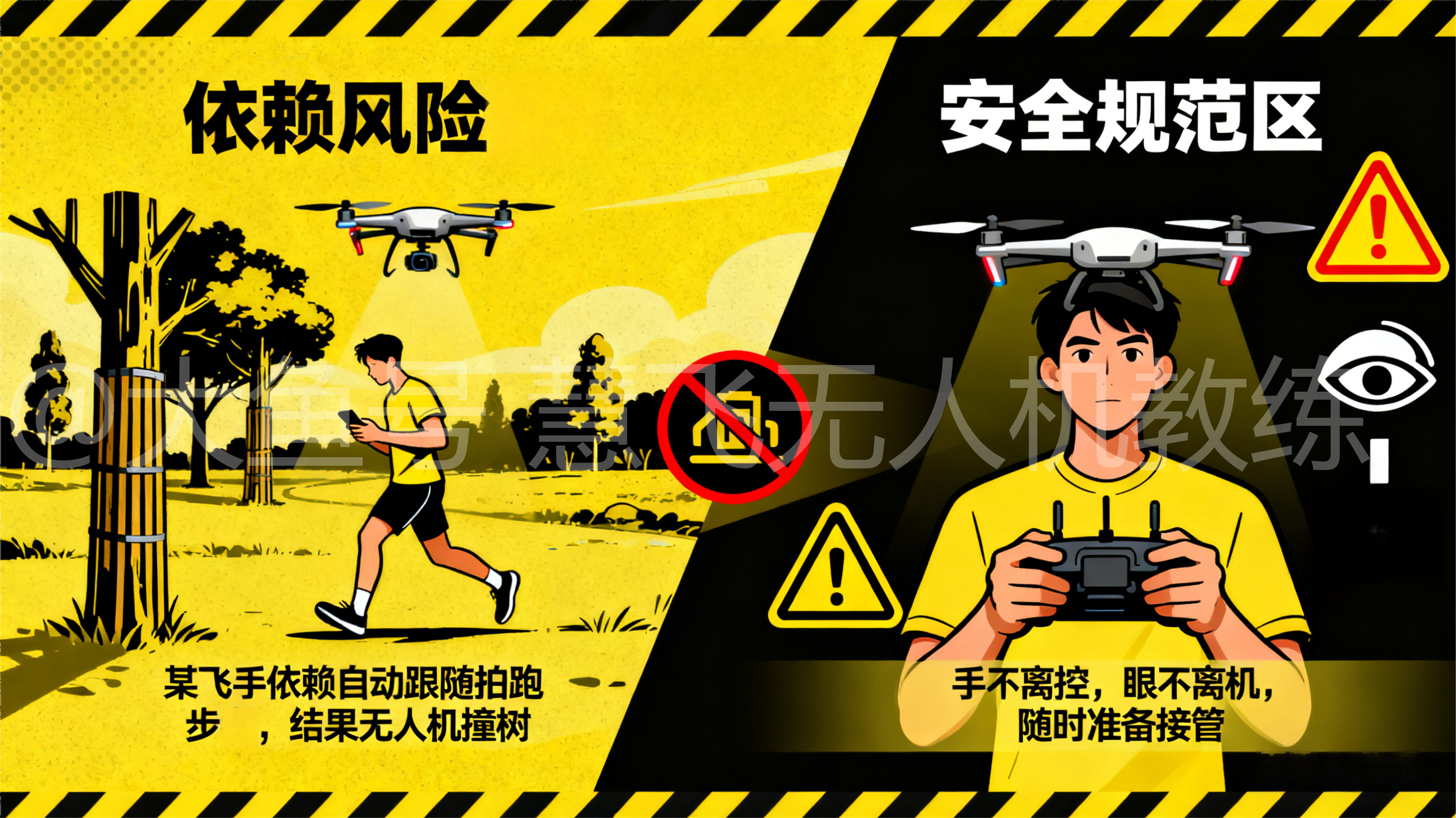 案例:某飞手依赖自动跟随拍跑步者,结果无人机撞树。