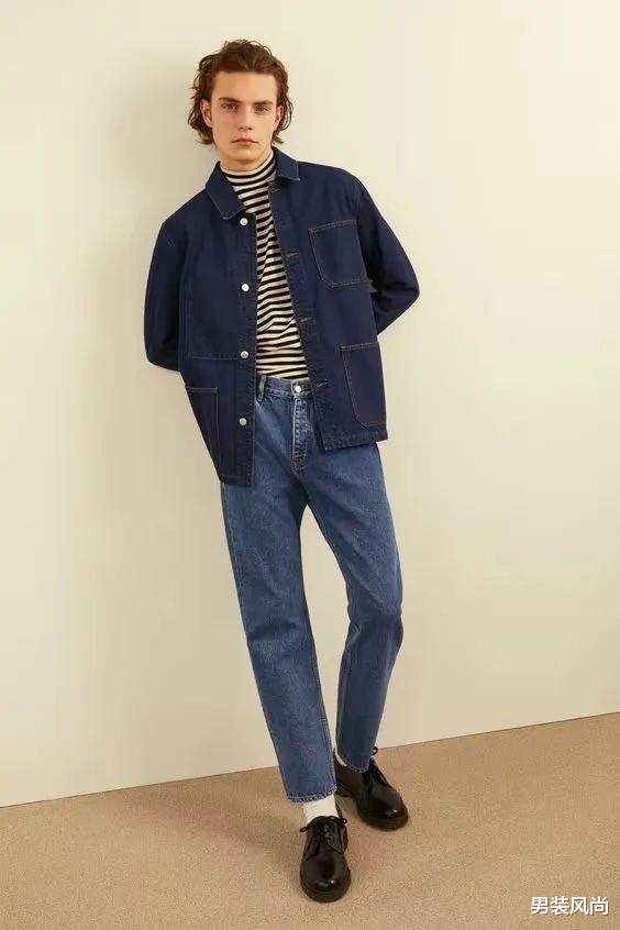 卡其色工装夹克与工装衬衫的搭配,充满了硬朗与不羁的气息。蓝色牛仔裤裤黑白相间的加入,让整体穿搭更加酷帅有型。3. 深蓝色工装夹克+条纹T恤+蓝色牛仔裤+黑色休闲鞋