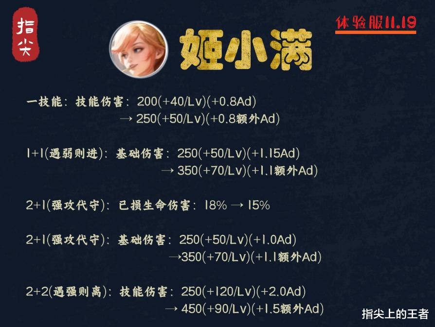 总结一下,姬小满的1技能削弱,21斩杀伤害削弱,但加强了11、21、22连招的输出,整体来看我不认为是削弱,甚至是加强。