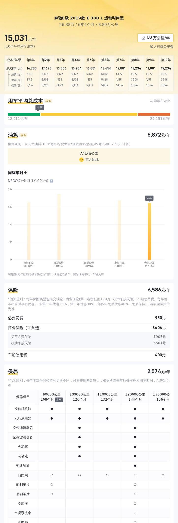 除了车况和配置,我们还需要考虑用车成本。根据一些汽车网站的数据,2019款奔驰E 300 L的百公里油耗大约在8-10L左右,保养费用相对较高,每年大约需要花费5000-8000元。保险费用也比普通品牌车型更高。这些都是你在购车前需要考虑的因素。