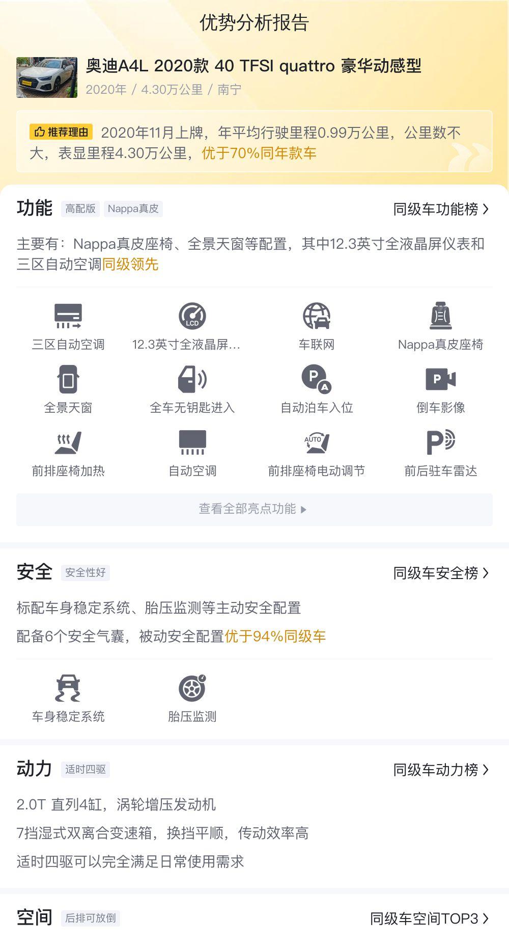 最后,我们来做一个简单的总结。这款17.98万元的2020款奥迪A4L 40 TFSI quattro豪华动感型二手车,在价格方面极具优势。虽然是二手车,但其车况良好,“三非”车辆认证,并配备了quattro四驱系统和丰富的配置,动力充沛,空间宽敞,性价比极高。