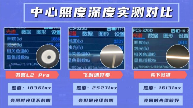 · 实测方法:在标准40cm的测试距离下,使用专业光谱仪测量三款台灯的中心照度值。