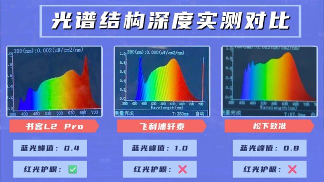 · 实测方法:在暗室环境中,使用专业光谱仪对三款台灯进行光谱分析,统一设置色温为4000K,记录蓝光峰值和红光表现。