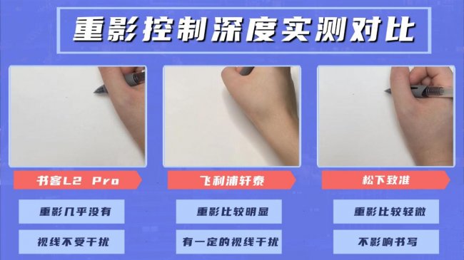 3、重影控制:· 重要性说明:书写时的重影会遮挡笔尖和字迹,迫使孩子不自觉地调整姿势,长期可能影响坐姿和视力健康。优秀的重影控制能提供更流畅的书写体验。