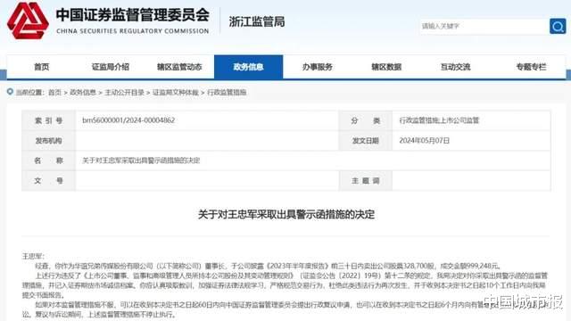 2024年5月7日,浙江证监局发布关于对王忠军采取出具警示函措施的决定。经查,其作为华谊兄弟传媒股份有限公司(以下简称公司)董事长,于公司披露《2023年半年度报告》前三十日内卖出公司股票328,700股,成交金额999,248元。