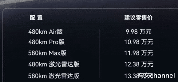 480km 激光雷达版 官方指导价 12.38万元