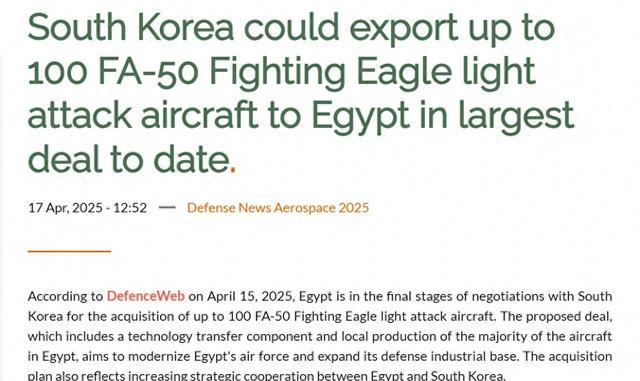 不过,就在中方机队抵达埃及之际,有一些外媒却报道了埃及空军准备采购100余架韩国造FA-50战斗教练机的消息。尽管在大家看来,中埃空军演习之际,外媒报道埃及空军采购韩国战机的消息显得有些出乎意料!但是目前来看,埃及采购这批韩国战机的可能性确实不小。