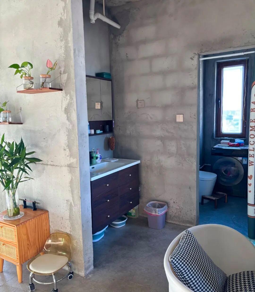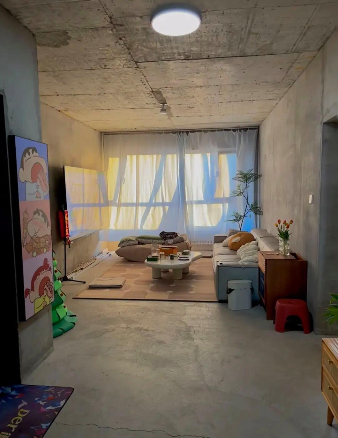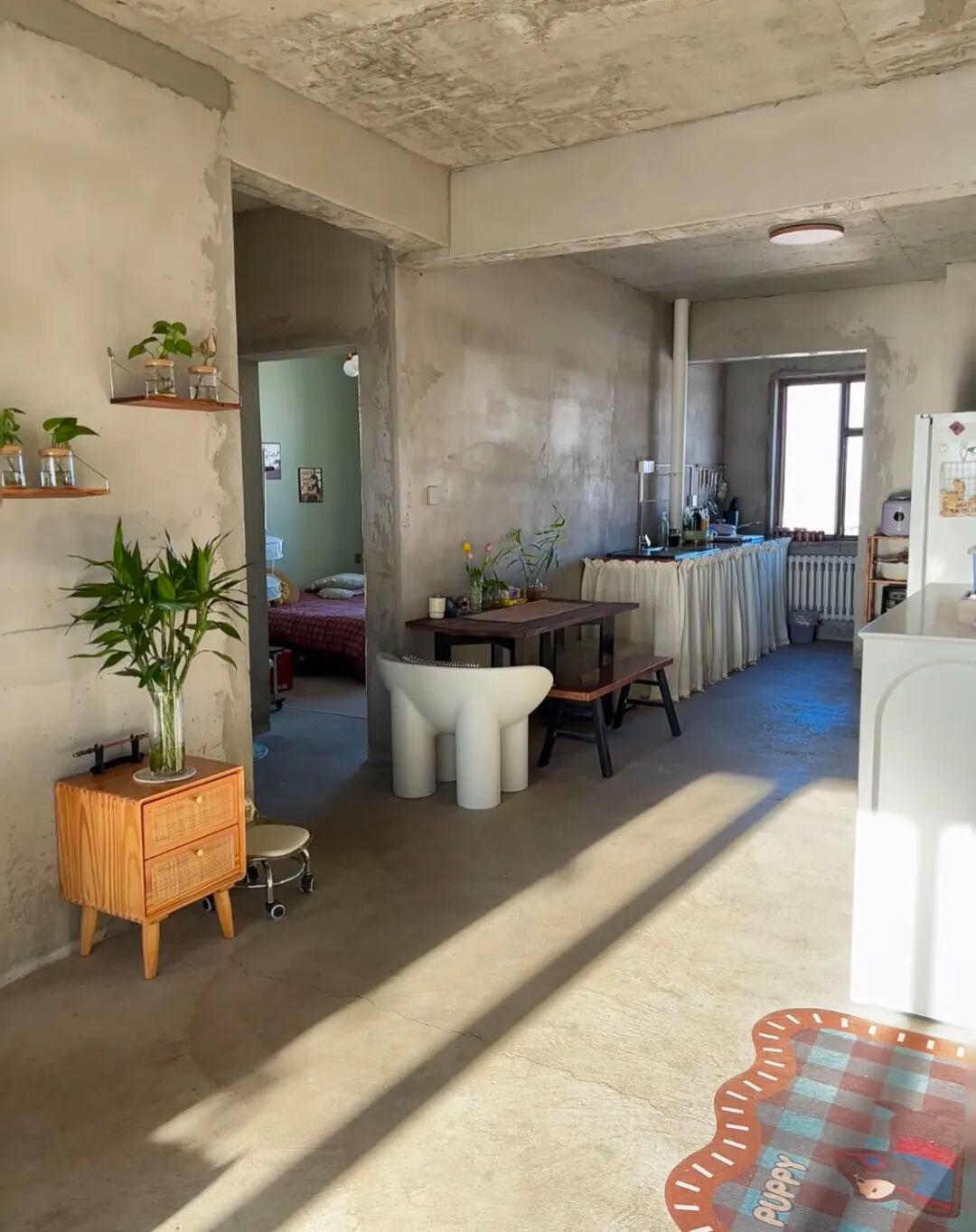 这个毛坯房的硬砖真的很简单,水泥地不贴砖,天花板不做吊顶,家具基本是从二手市场淘回来,稍微拾掇,也很有烟火气。