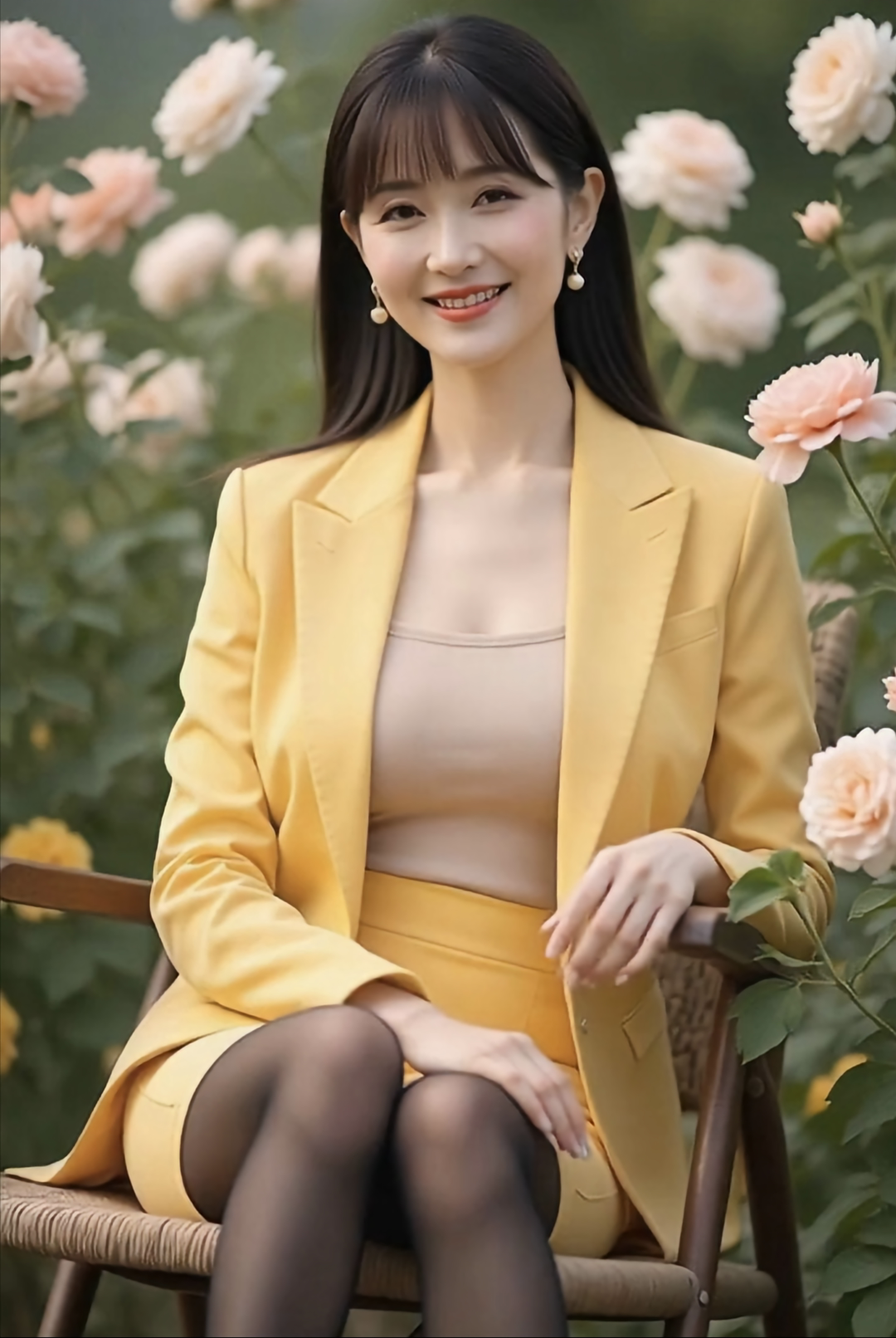 这位阿姨穿了一身亮黄色的西服裙装,但看起来不会太刺眼,因为她很会搭配。里面穿了一件淡淡的奶油杏色打底衫,让黄色显得柔和不少。她还配了一条黑色丝袜,压住了黄色的张扬感,整体看起来既稳重又时尚。这种搭配很巧妙,用百搭的中性色比如奶油杏和黑色来中和亮眼的黄色,既时髦又不夸张。如果鞋子也选同色系的会更协调。这真是上了年纪的人穿亮色的好示范,用基础色压住鲜艳色,用过渡色连接肤色,最后的效果就是既抢眼又舒服,时尚又大方。