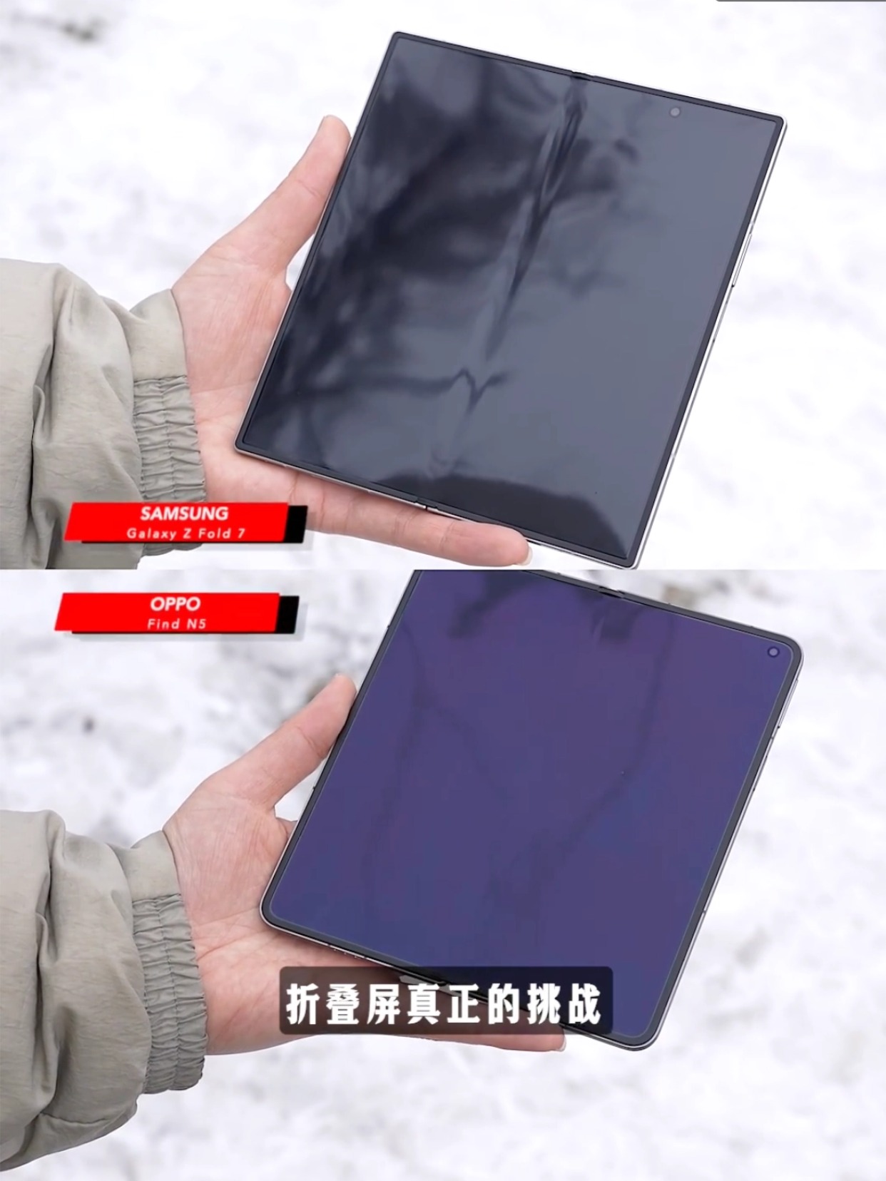 其实在OPPO Find N5时,OPPO的折痕控制就很领先了,前几天有博主在零下2℃的雪地测试了Find N5和三星Z Fold7的折痕,在折叠5000多次后,两者的屏幕折痕表现都不错,其中OPPO的折痕控制略胜一筹,非常浅,日常使用是几乎感知不到,N5这么强了,那Find N6还真有可能做出「视觉无折痕」!