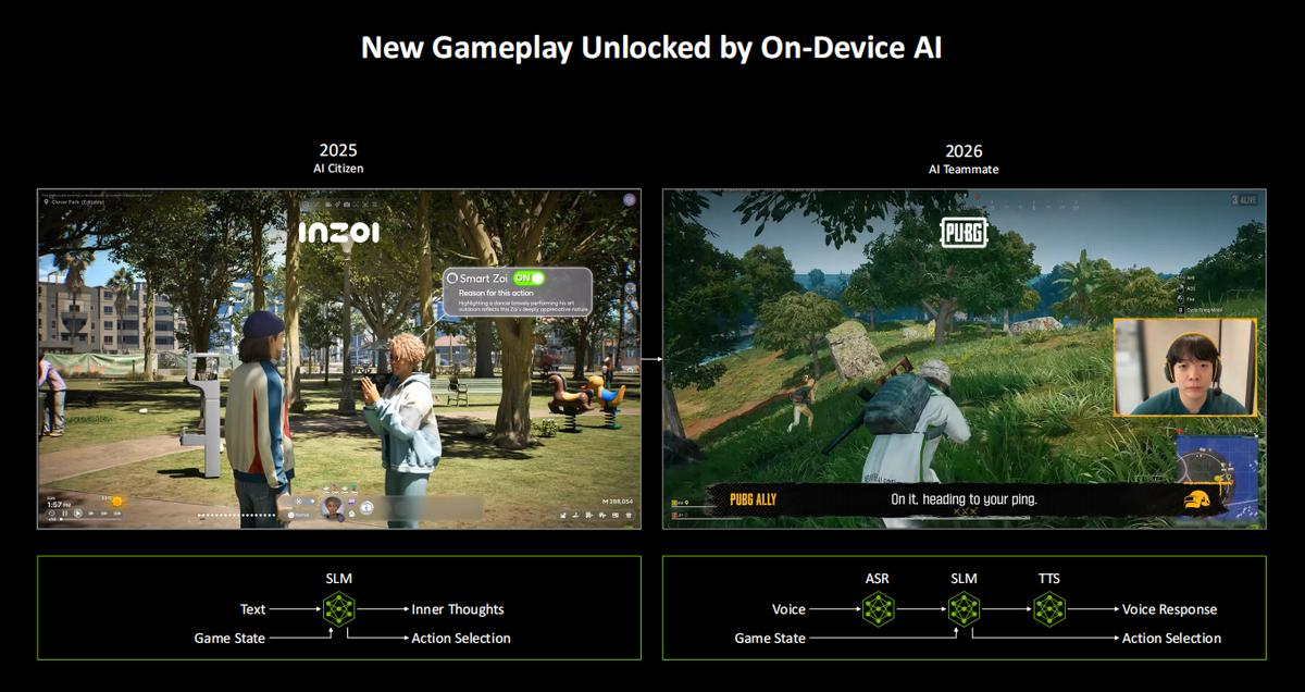 游戏中的NPC角色通常会严格按照规则,为玩家提供剧本化的交互体验。现在NVIDIA正在扩展全套NVIDIA ACE AI技术,将对话型NPC转变为拥有自主意识的游戏角色,利用AI像真人玩家一样进行感知、计划和行动。从图中展示的内容可以看到,2025年,NVIDIA在《INZOI》中打造了AI市民,而在2026年里,《PUBG》也将迎来AI队友。