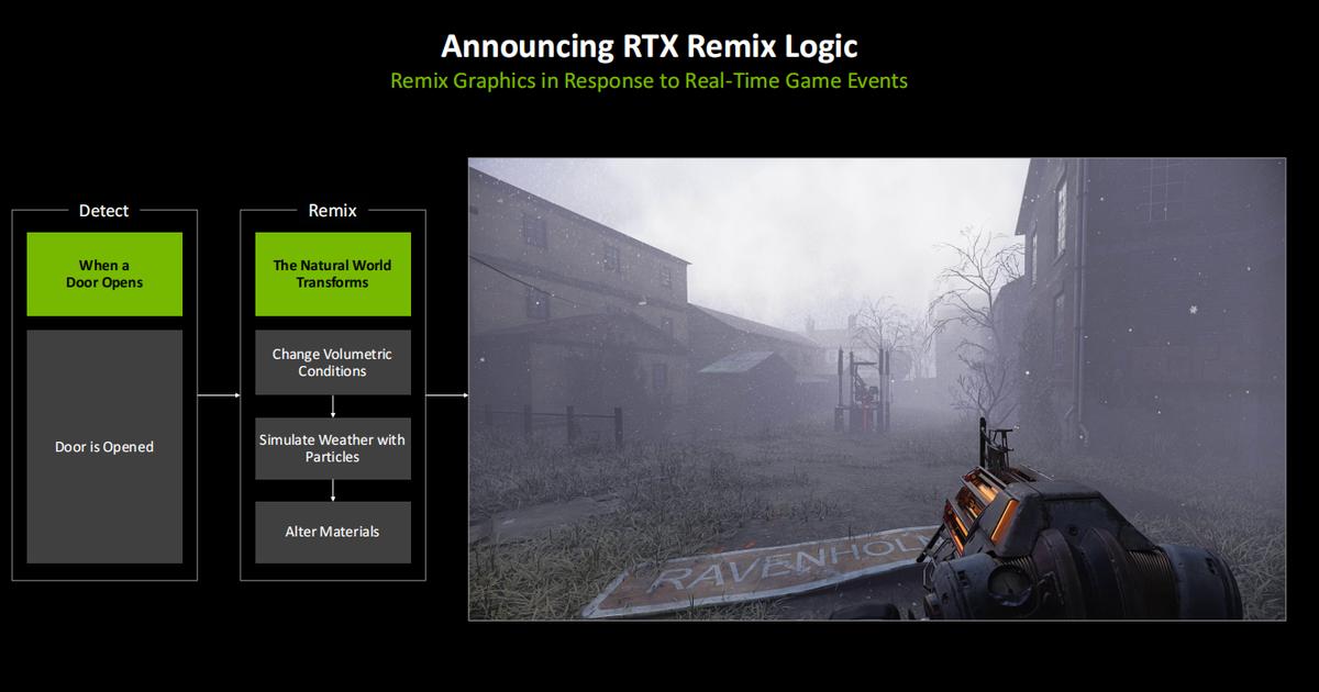 例如侦测到玩家在游戏中打开门,RTX Remix Logic可以实现现实世界的变化,包括变更体积条件、用粒子模拟天气、改变材质等等。