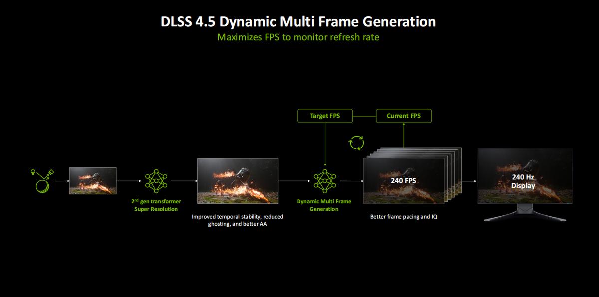 DLSS 4引入的4×多帧生成受到了玩家的一致好评,而DLSS 4.5进一步带来了6×多帧生成,而且它还支持动态调节技术,让游戏帧率经过提升后保持在240Hz电竞刷新率水平,提供更好的帧率节奏和图像质量。