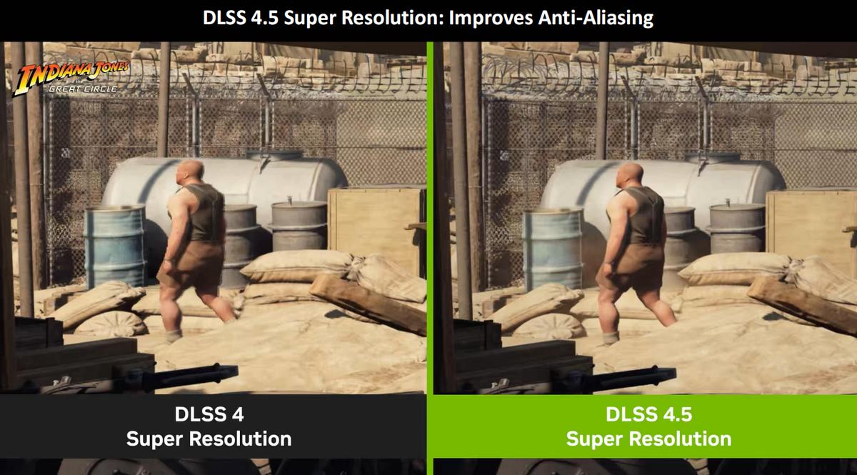 同时,DLSS 4.5也大幅提升了抗锯齿的效果。从《夺宝奇兵:古老之圈》截图可以看到,相比DLSS 4,开启DLSS 4.5超分辨率后,人物边缘模糊的锯齿消失了,边缘变得更加细腻精准。