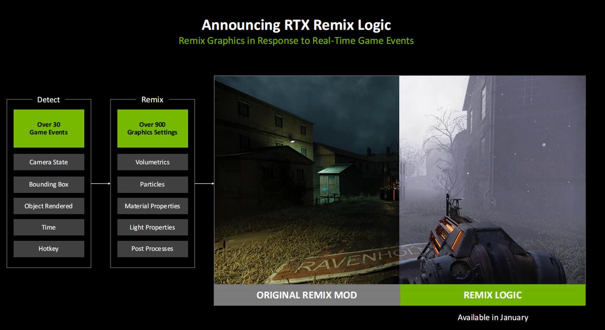 新增的RTX Remix Logic可以在游戏中对实时游戏事件做出响应,目前可以对超过30种游戏事件进行响应,响应内容包括对超过900种图形设定。