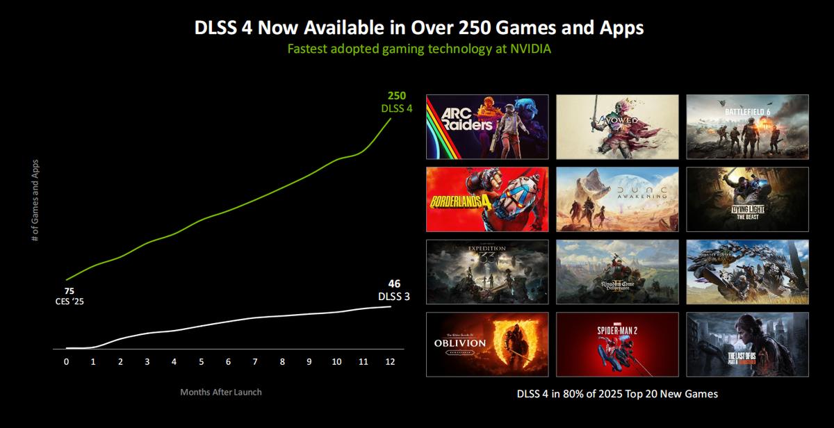 到目前位置,支持DLSS 4的游戏和应用已经超过了250个,而在2025年排名前20的游戏大作中,有80%都支持DLSS 4。由此可见,NVIDIA的DLSS技术已经得到了业界的广泛支持,堪称优秀游戏大作的标配功能。