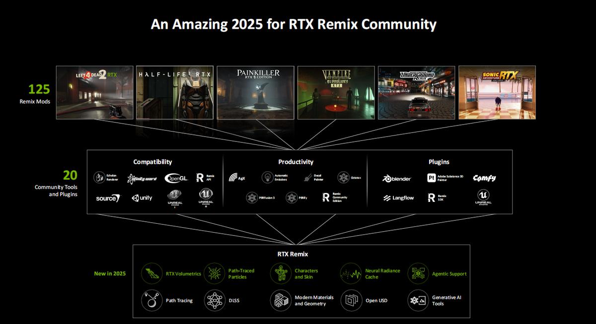我们知道RTX Remix是NVIDIA推出的一项可以给老游戏添加次世代画面与RTX功能的工具集,可以让老游戏快速推出RTX“重制版”,重新焕发活力。目前已经有125个Remix Mods与20个社区工具与插件。现在NVIDIA推出了RTX Remix的更新。