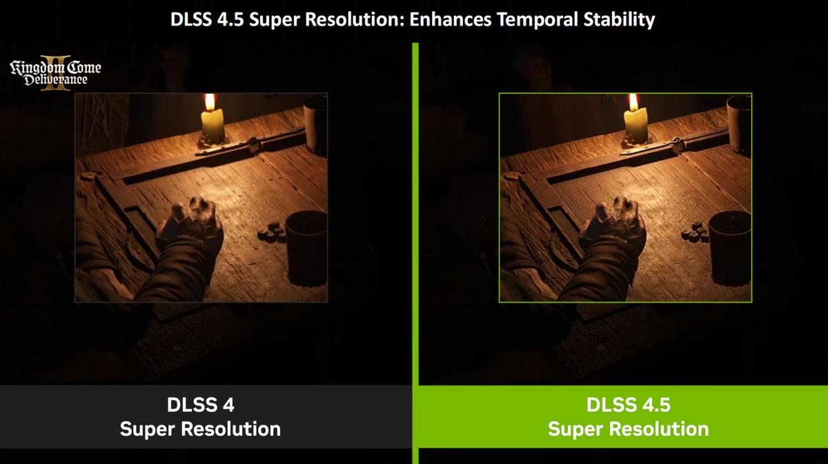 从《天国:拯救2》游戏截图可以看到,开启DLSS 4.5超分辨率之后,相比DLSS 4的画面更加精致,时间稳定性更好,整体细节度更加完整。