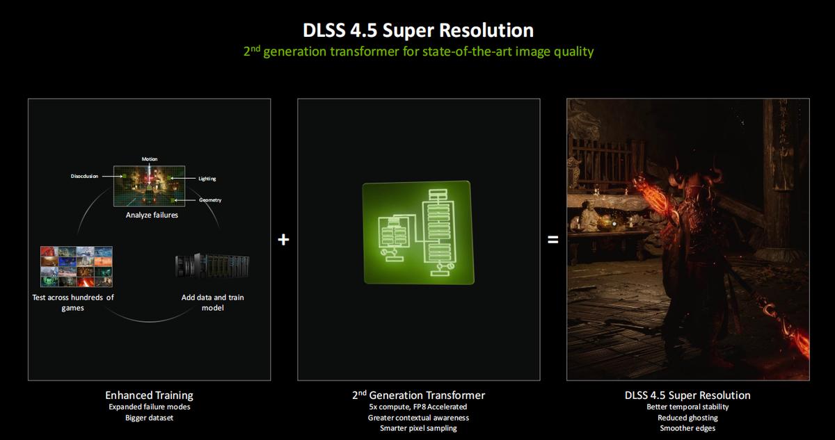 DLSS 4.5的超分辨率技术在模型端大幅增强了训练规模,在数百个游戏中进行了测试,同时采用了第二代Transformer模型,支持五倍的计算、FP8加速,具备更强的上下文感知能力和更智能的像素采样。因此DLSS 4.5超分辨率技术可以提供更佳的时间稳定性、减少重影现象,让目标边缘更平滑。