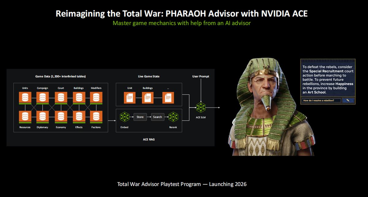 Creative Assembly 开发了屡获殊荣的《全面战争》系列,而在《全面战争:法老》中将通过 NVIDIA ACE打造的全新动态AI顾问,帮助玩家学习游戏中众多的系统和机制。NVIDIA ACE通过处理玩家的指令、当前游戏状态以及从游戏复杂数据库中检索的数据,让AI顾问可以提供实时、贴合语境的引导,在能够根据玩家的实际操作进行自适应的同时,保持角色设定,并忠实于游戏的世界观和时代背景。