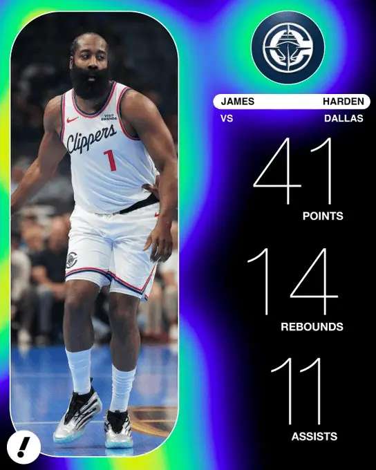 哈登全场出场 51 分钟(总共 58 分钟)拿下入场最高的 41 分,25 投 13 中,三分 12 投 6 中,还送出 14 篮板 11 助攻大号三双,同时防守端有 2 次封盖 1 次抢断。