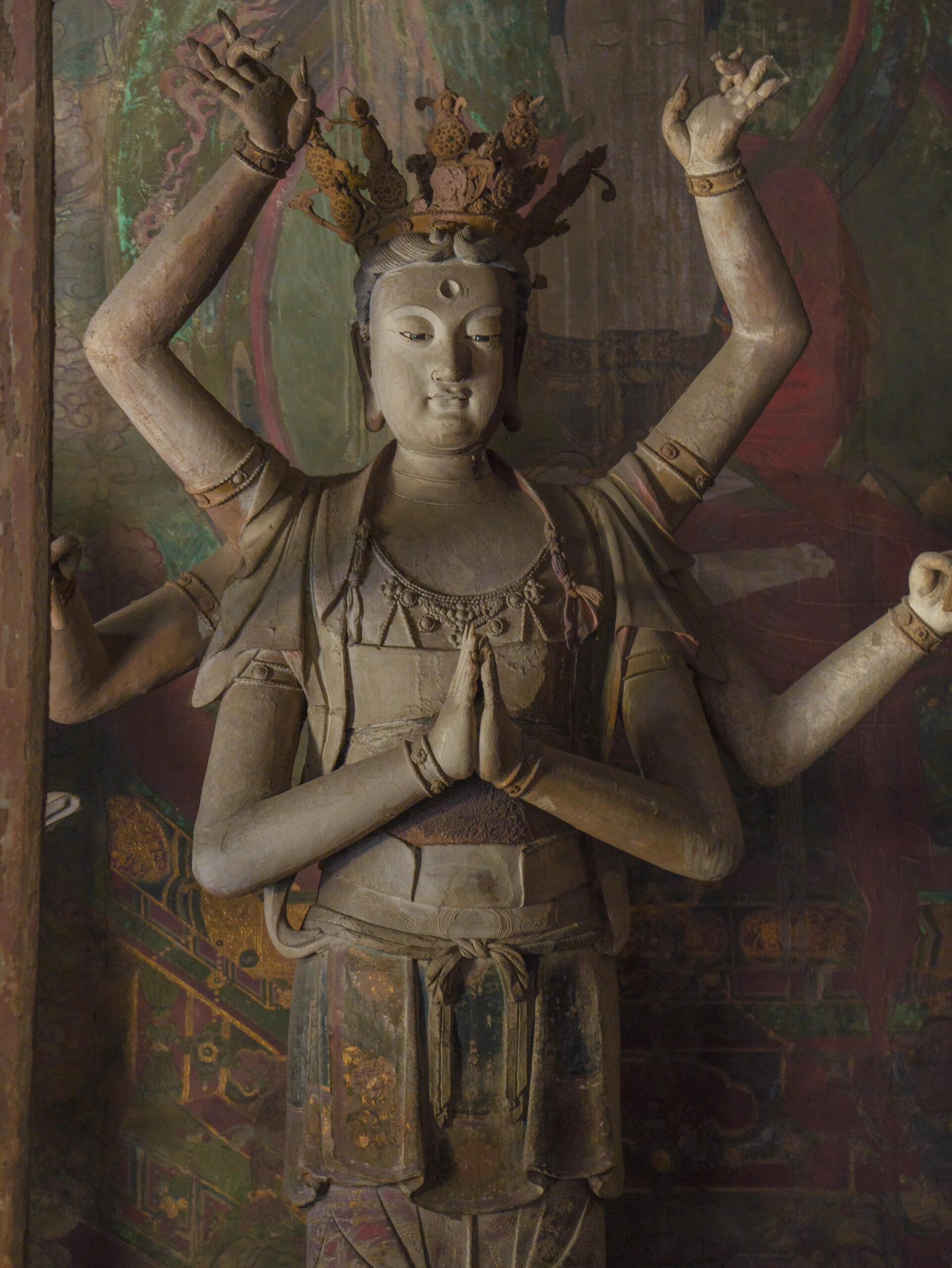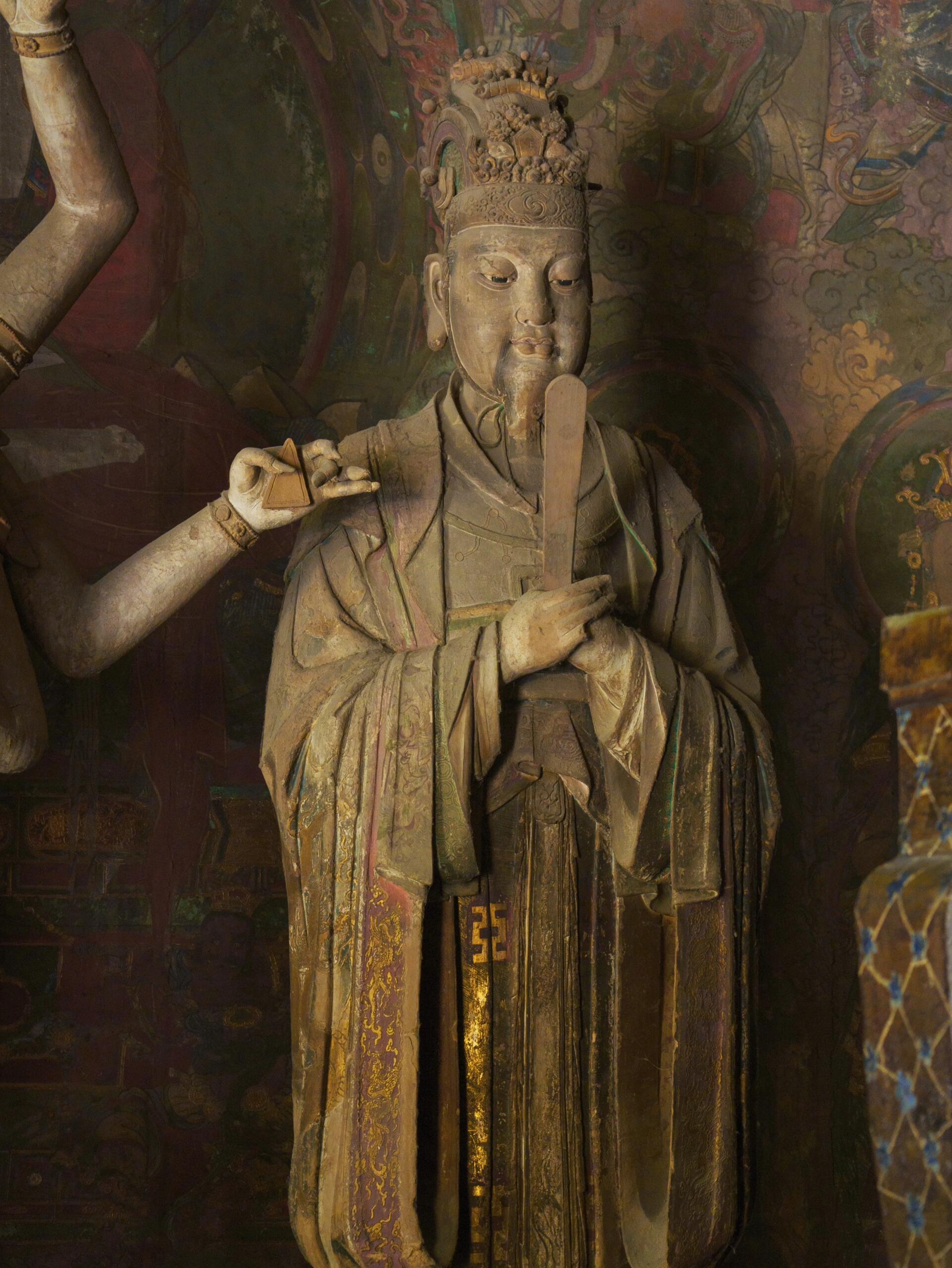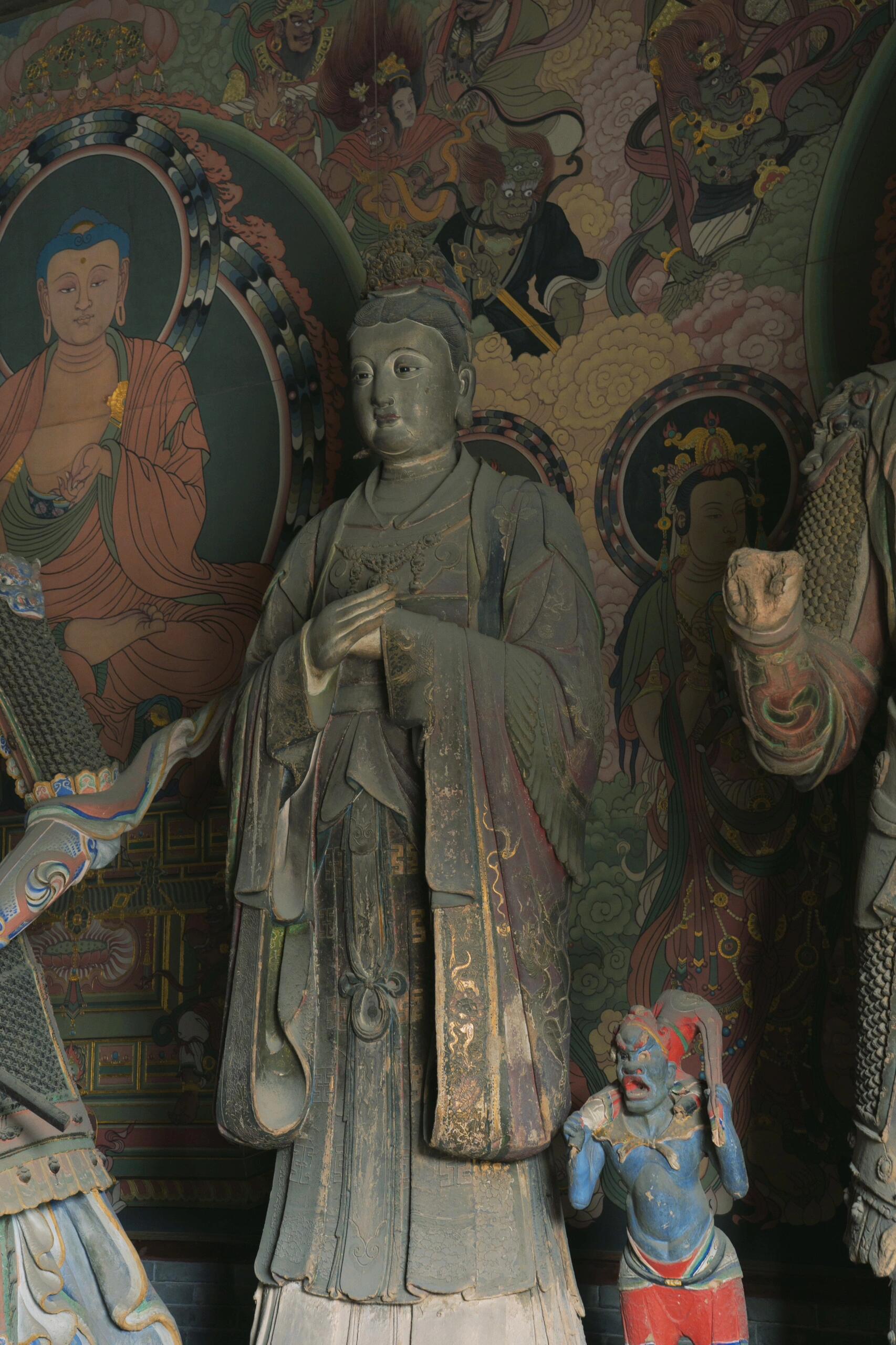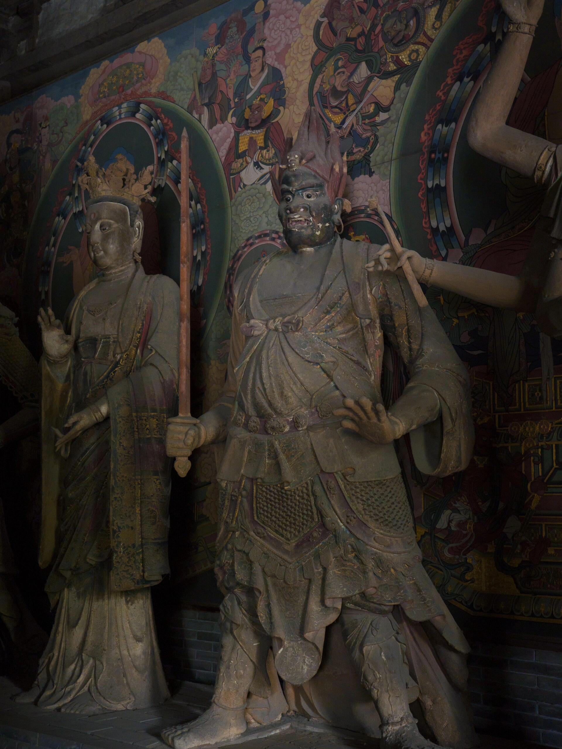 如果说五方佛展现的是庄严与神圣,那么二十四诸天像则将灵动与鲜活发挥到了极致。这些塑像或怒目圆睁,如金刚般威风凛凛;或低眉垂目,似菩萨般慈悲柔和。每一尊塑像都有其独特的神态和气质,有的手持法器,神情肃穆,仿佛随时准备降妖除魔;有的手持莲花,面容温婉,传递出宁静祥和的气息。辽代佛像的豪迈在诸天像上也有体现,他们宽宽的肩膀、厚实的胸膛,尽显力量之美;而金代工匠在塑造时,又着重刻画了肌肉的饱满感,甚至连指甲盖这样的细节都精雕细琢,力求真实还原人物的形态。