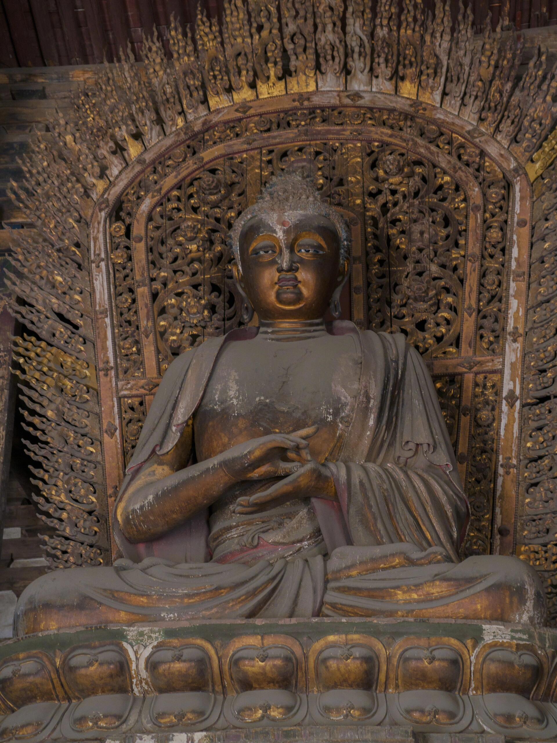 首先映入眼帘的是大殿内的五方佛。佛像造型端庄,宽肩厚背,身姿挺拔。不同于后世佛像的纤细柔美,辽代佛像自带一股力量感,仿佛能撑起天地。工匠们在塑造佛像时,着重刻画其威仪天成的神态,眉眼微微低垂,目光沉静,似在俯瞰众生,又似在思索宇宙的奥秘。佛像的衣纹处理更是一绝,线条流畅自然,如行云流水般顺着身体的轮廓起伏,看似简单的几笔,却让静止的雕塑有了动态的韵律。尤其是衣褶的刻画,深浅不一,层次分明,仿佛能让人感受到布料的质感和随风飘动的轻盈。