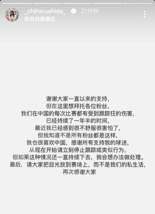 志田千阳在公告里写道:“谢谢大家一直以来的支持,但在这里想拜托各位粉丝,我们在中国的每次比赛都有受到跟踪狂的伤害,已经持续一年半的时间,最近我已经感到很不舒服很害怕了!但我知道不是所有粉丝都这样,我也很喜欢中国,感谢所有支持我的球迷。从现在开始请立刻停止跟踪或类似行为,但如果这种情况还一直持续下去,我会想办法做处理。最后,请大家将目光放在赛场之上,而不是我们的私生活,再次感谢大家!”