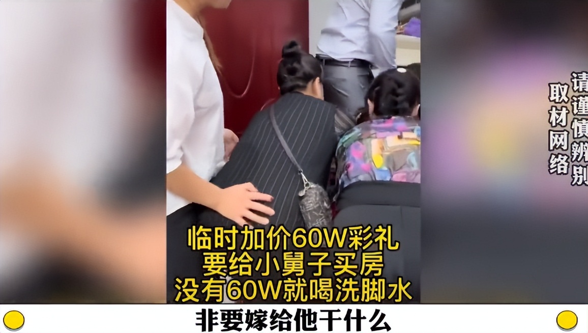 张先生一听不喝洗脚水了,连忙询问什么证明方法,结果丈母娘接下来的话让他傻眼,丈母娘说道要再追加60万的彩礼。这时丈母娘提醒了一下新娘,新娘也开始帮她妈说话。