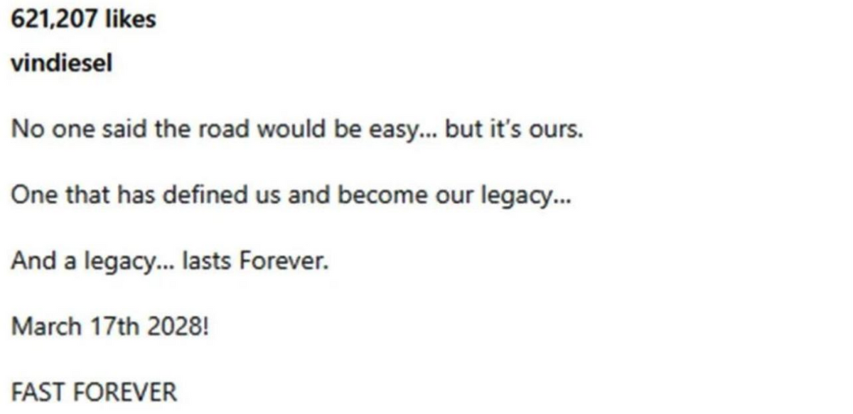 他晒出一张与保罗·沃克的经典合照,配文里的字字句句都饱含着对过往的怀念和对传承的坚守,也正式公布了《速激11》的英文片名《Fast Forever》,同时敲定影片将于2028年3月17日在北美院线登陆。
