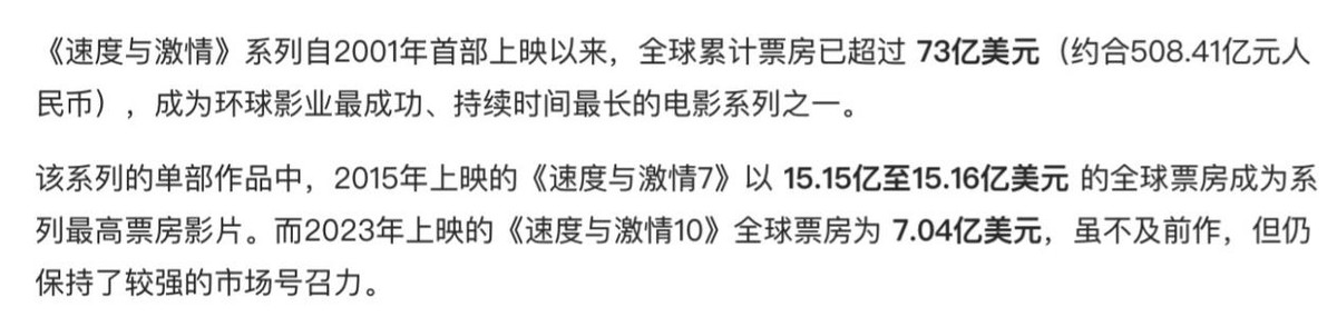 在中国市场,这个系列更是创造了进口片的票房传奇,截至《速激10》,系列内地总票房已突破87亿元,成为最受中国观众欢迎的好莱坞系列电影之一。