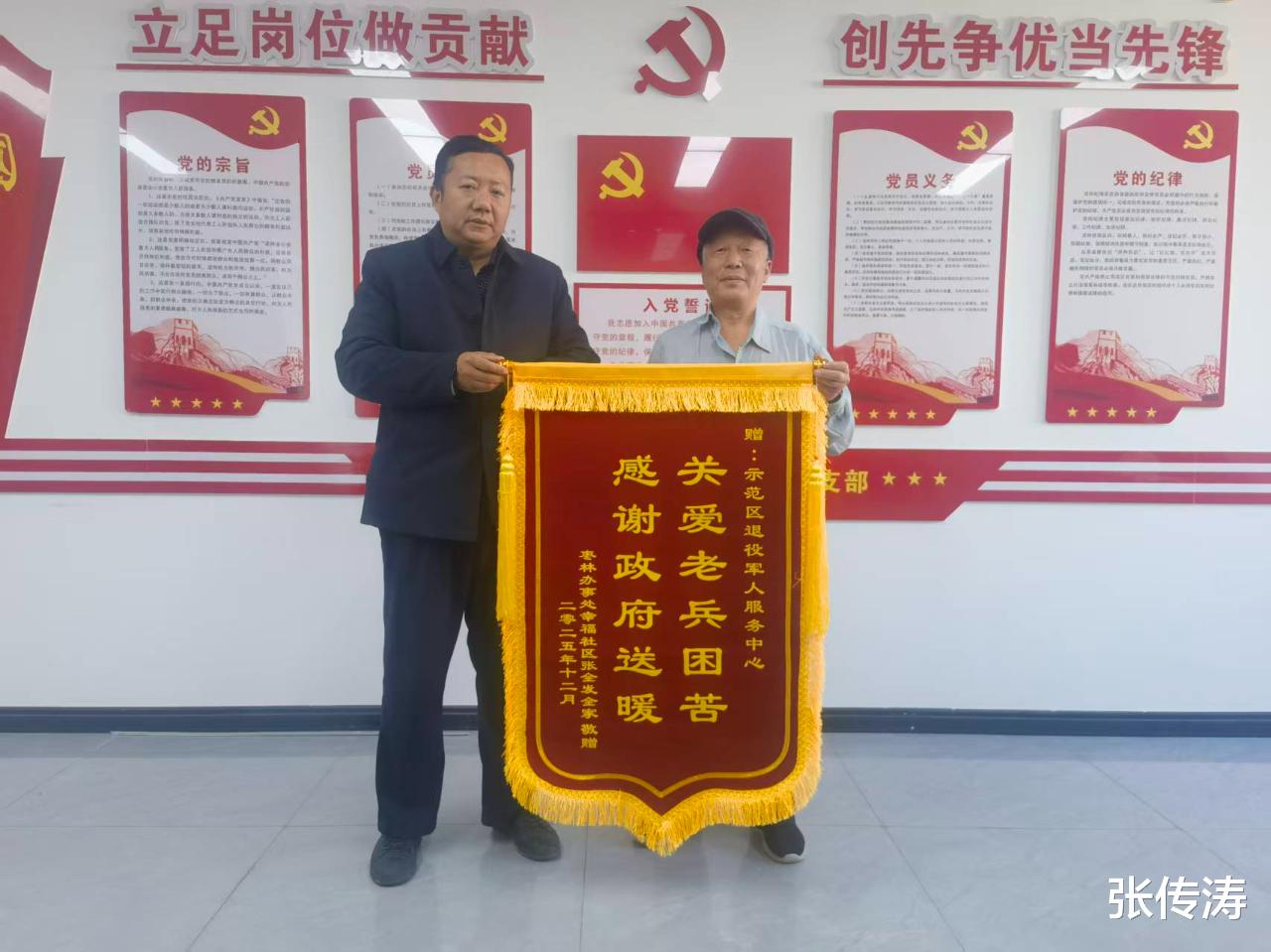 12月25 日,河南省南阳市城乡一体化示范区枣林街道幸福社区退役军人张金发代表全家,把一面“关爱老兵困苦、感谢政府送暖”的锦旗送到该区退役军人服务中心主任张红彬手中,感谢该中心解决其生活和医疗等方面的实际困难。