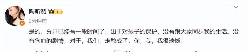 2024年3月25日,一则消息在娱乐圈引起了广泛关注——曾因饰演《甄嬛传》中安陵容一角而走红的演员陶昕然,在社交媒体上发文承认与丈夫何建泽已经离婚。她坦诚地表示,两人分开已有一段时间,但出于对孩子的保护,未及时对外公布。陶昕然的发文简洁而克制,没有过多的情感宣泄,却让人感受到她内心的遗憾与无奈。她写道:“我们,走散成了,你,我,我很遗憾!”这一句话道尽了两人婚姻的终结,也让人不禁感叹爱情与现实的残酷。