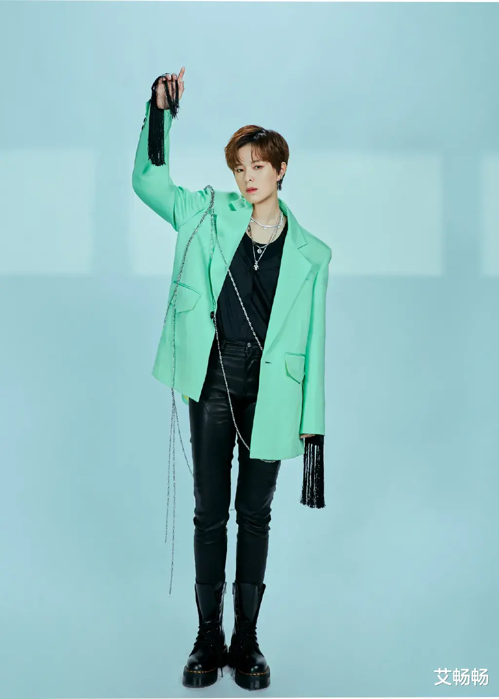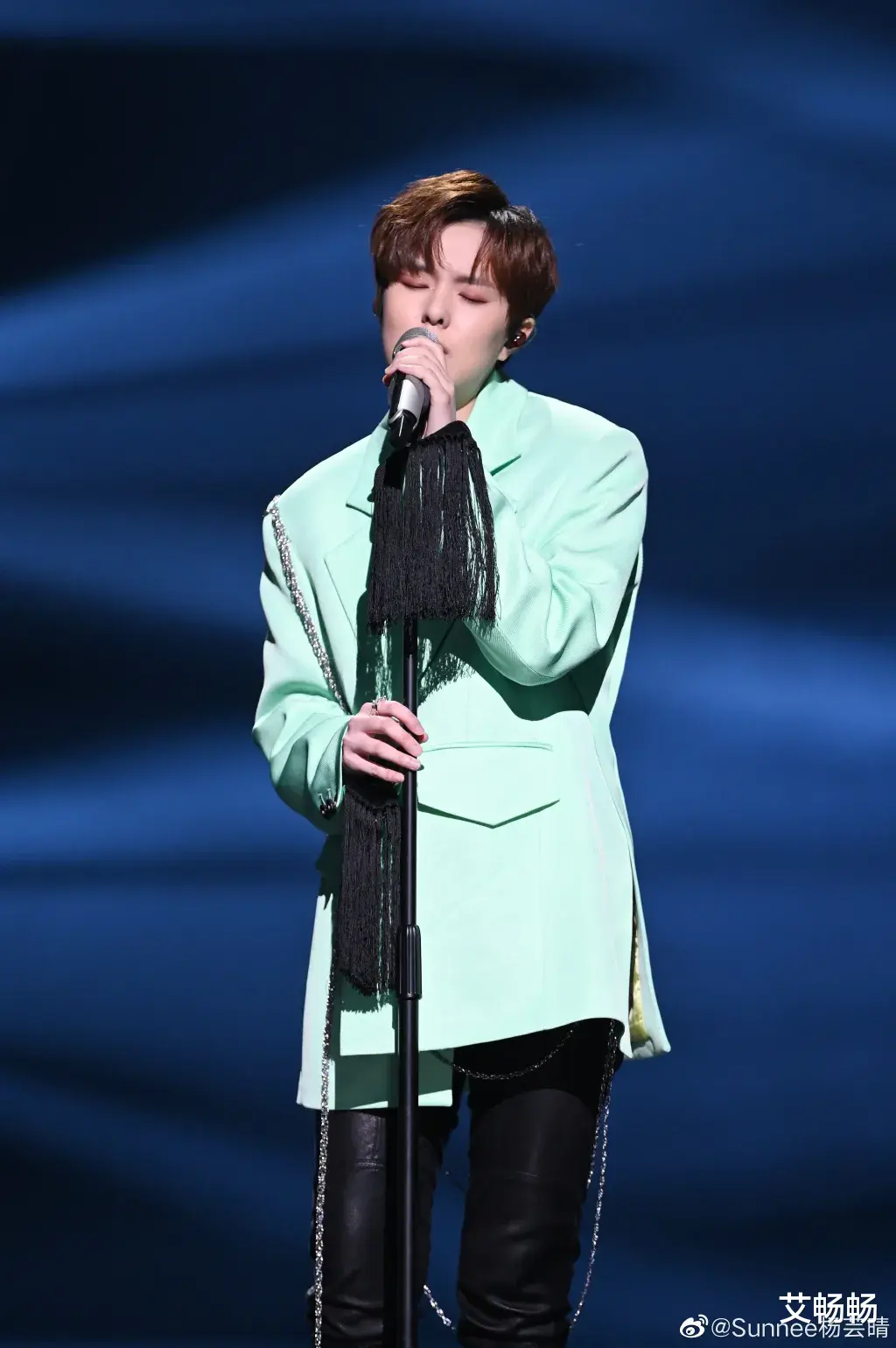 华灯起,薄荷绿西装加黑色皮裤亮相的Sunnee出现在众人面前,清新又飒气,恍然以为是毕业典礼上的《擎歌》现场。