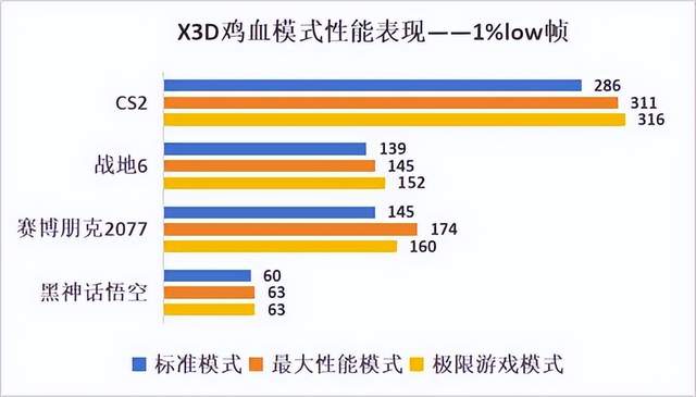 除了理论测试,在游戏实测中,X3D鸡血模式2.0也是有着不错的表现,在1080P下,可以看到开启后,平均帧提升还是明显,其中提升最大的是战地6,提升幅度达到7.9%。而在1%low帧上,也有很好的表现,像CS2中最大性能模式下提升8.7%,极限游戏模式下提升10.4%。虽说具体表现还跟游戏本身的优化有关,但通过对比发现还是都有提升的。