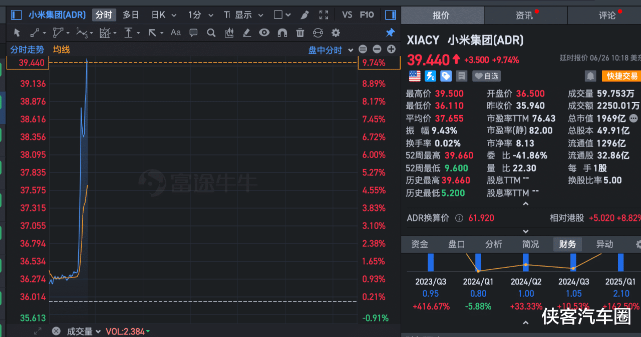 受到大定20万辆的消息,小米集团美股的ADR直线拉升,直冲云霄,10分钟内拉涨10%。小米集团美股总市值1940亿美元左右。
