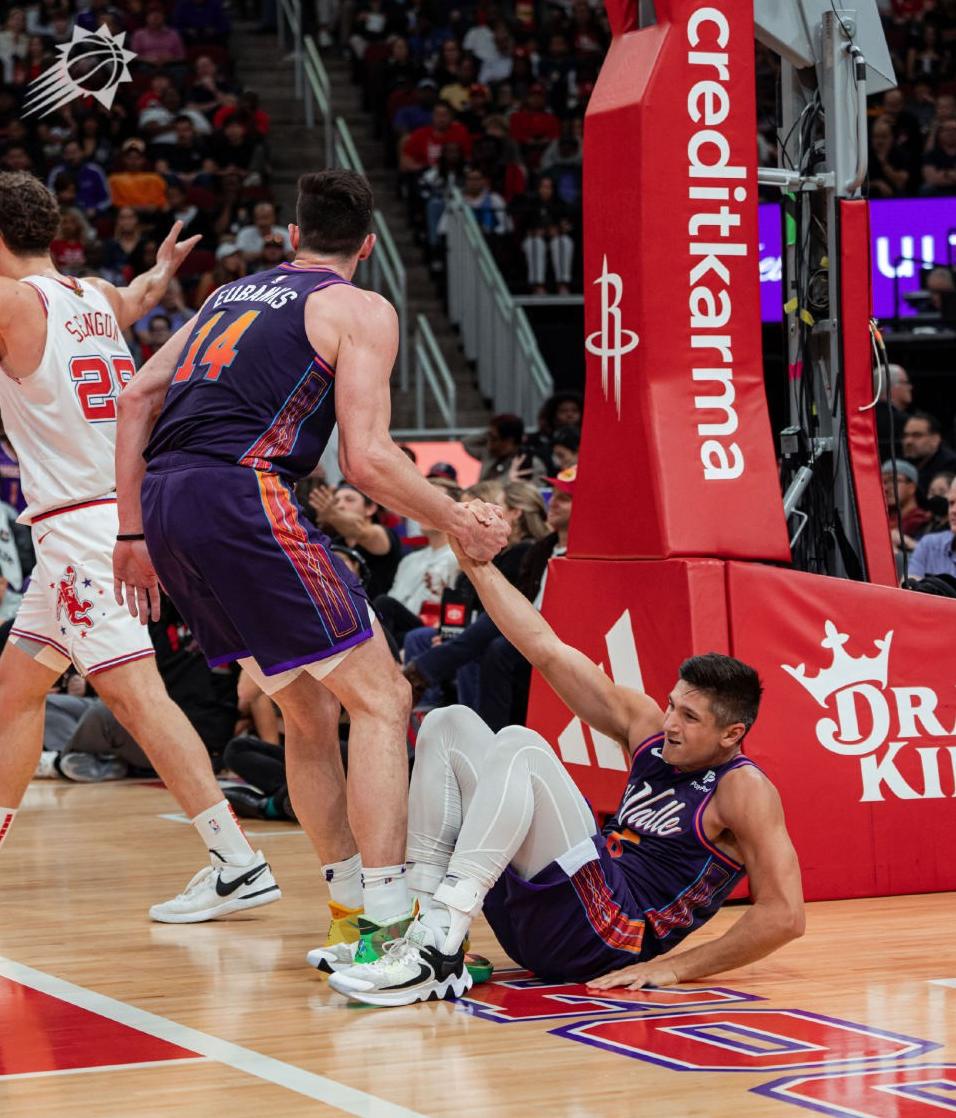 太阳队试图在杜兰特的带领下扳回局面,他多次突破、投篮,像个无所不能的战士。