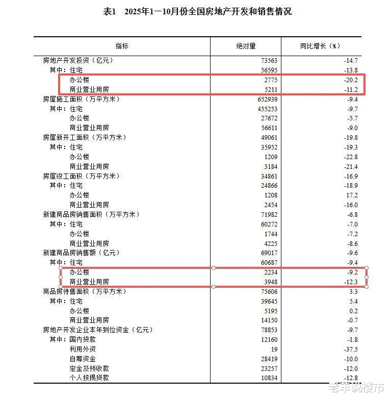 根据国家统计局数据:2025年1-10月全国办公楼开发投资下滑20.2%,商业营业用房下滑11.2%;新建办公楼销售额下滑9.2%,商业营业用房销售额下滑12.3%。